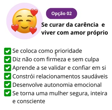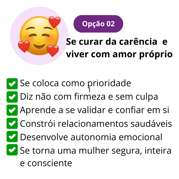 Você vai contar com o acompanhamento de uma especialista em carência emocional, que vai te guiar no passo a passo para reconstruir o seu amor próprio e recomeçar a sua vida, sentido-se uma mulher completa. segura e emocionalmente livre.