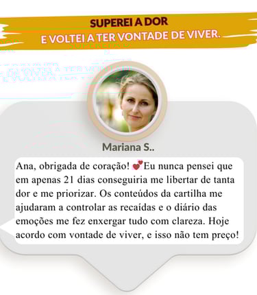 Sim! A Cartilha do Amor Próprio foi criado exatamente para mulheres como você: que já tentaram de tudo, mas continuam sofrendo com a dependência emocional, recaídas, ansiedade e dificuldade de se colocar em primeiro lugar. Funciona porque é um passo a passo simples, prático e guiado.Você não estará sozinha: todos os dias terá conteúdos, práticas e acompanhamento de uma especialista para te ajudar a transformar sua dor em força.