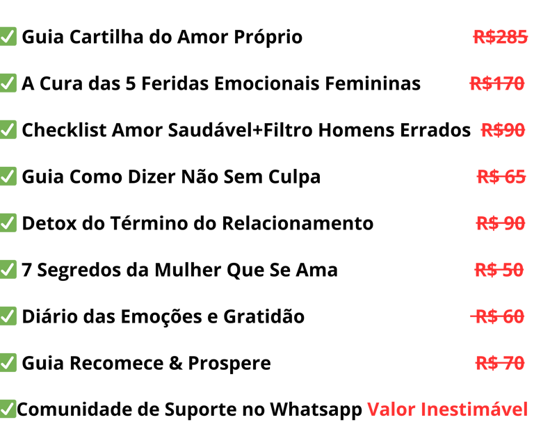 No total isso tudo deveria custar R$ 880,00. Mas hoje você vai ter acesso a Cartilha do Amor Próprio completa por apenas:
